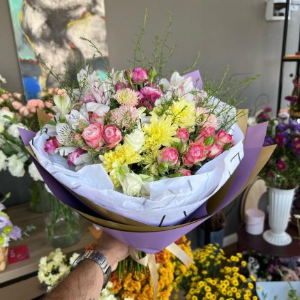 Букет из роз, лилии, альстромерии, гвоздики, кустовых роз, седума, бересклета и самшита в деревянном ящике “Дорнбирн”