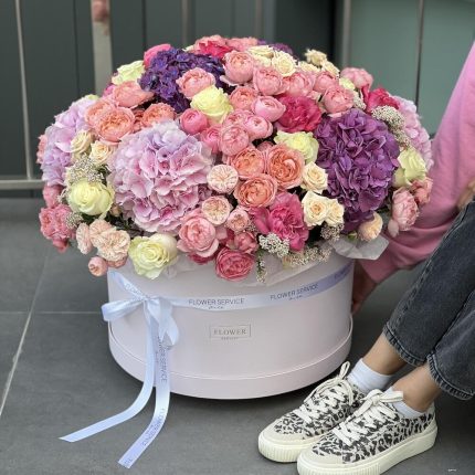 Тени в саду – Корзина с пионовидными розами, георгинами и дельфиниумом