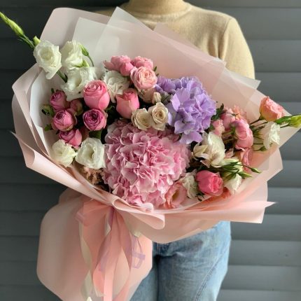 Букет из лизиантуса, гортензии, кустовой розы, эвкалипта и сезонных цветов “Маноло”