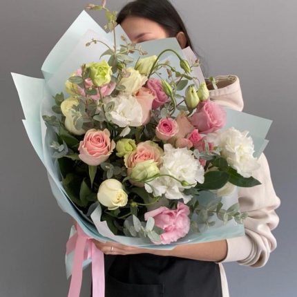 Ахматова Персиковый букет с пионовидной розой матиолой и папоротником