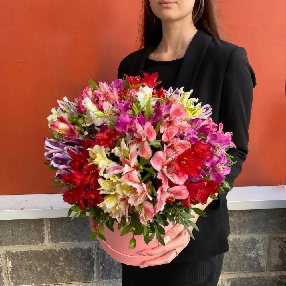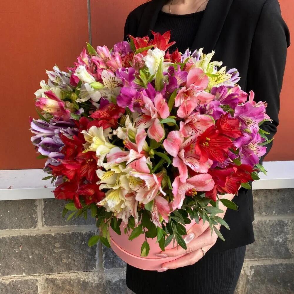 Альстромерия – 25 шт.Шляпная коробка – 1 шт.Оазис флористический – 1 шт.