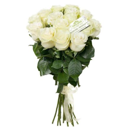 A bouquet of 21 white and pink Dutch roses "Jumilia" with a pink ribbon. The height of the stem is 55-66 cm.