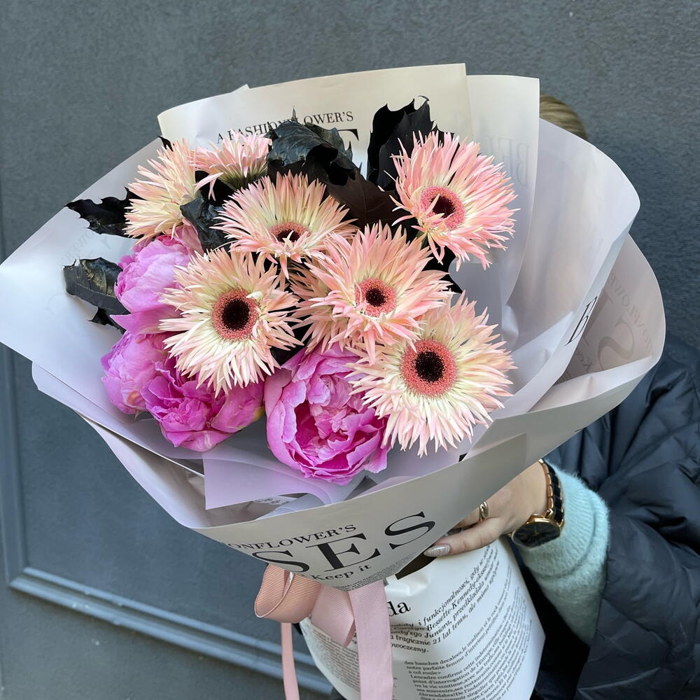 Букет в рожевих тонах. Ніжна композиція, яка включає в себе рожеву герберу, півонії сорту Sarah Bernhardt та фарбоване листя в стильному пакуванні.