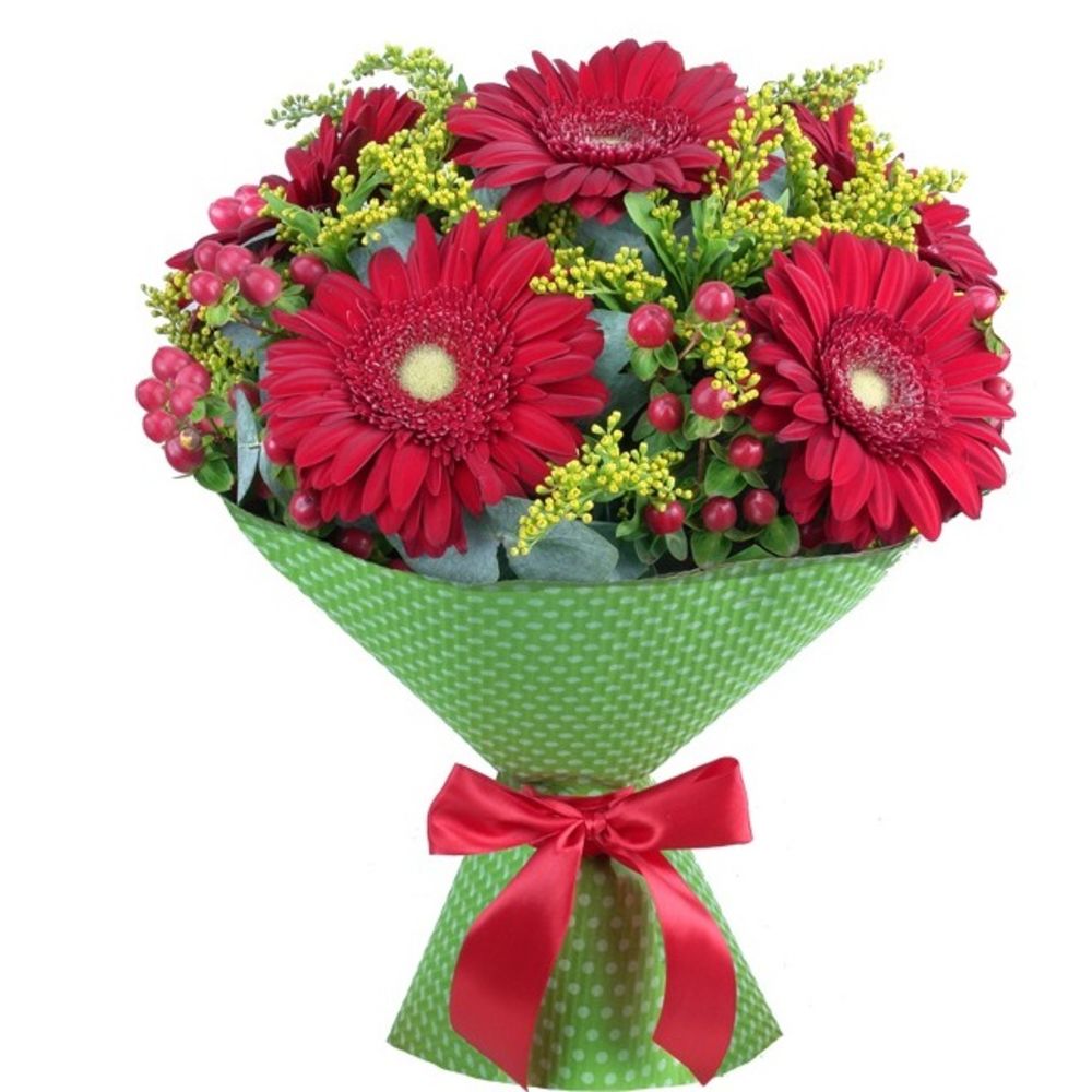 Солидаго – 1 шт.лента декоративная – 1 шт.Эвкалипт – 1 шт.Гиперикум красный – 5 шт.Гербера красная – 5 шт.