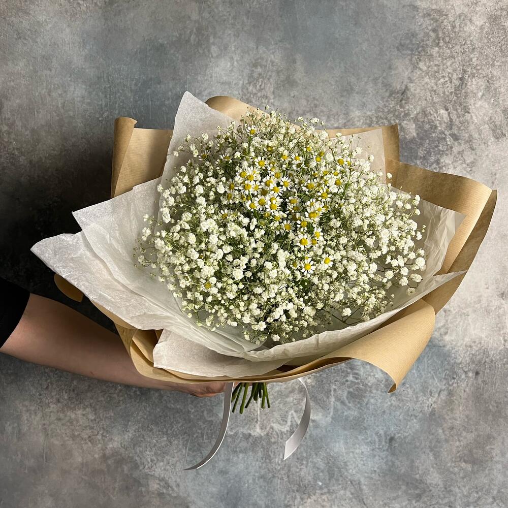 Гипсофила – 5 шт.Матрикария – 5 шт.Упаковка дизайнерская – 2 шт.Лента атласная – 1 шт.