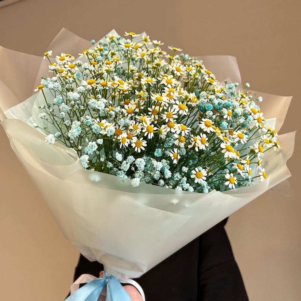 Гипсофила – 4 шт.Ромашка кустовая – 5 шт.Упаковка дизайнерская – 2 шт.