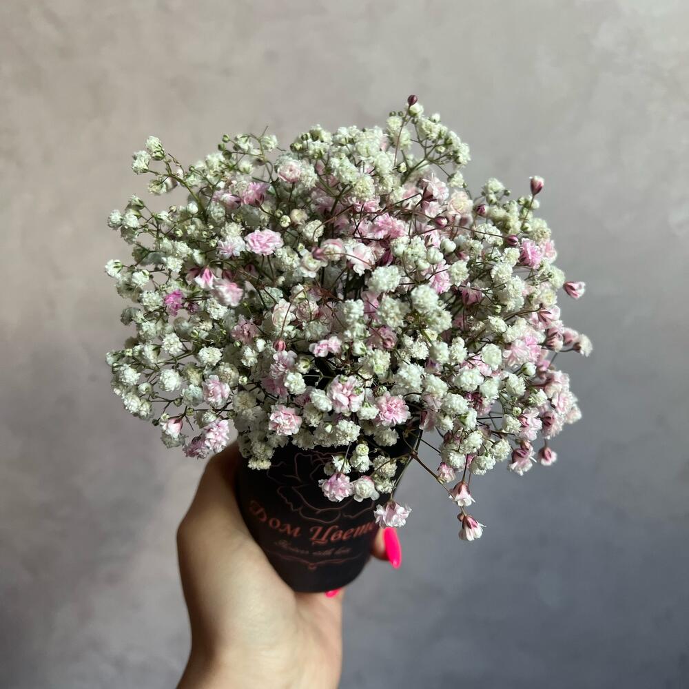 “Сиреневый туман” – композиция из гипсофилы в шляпной коробке