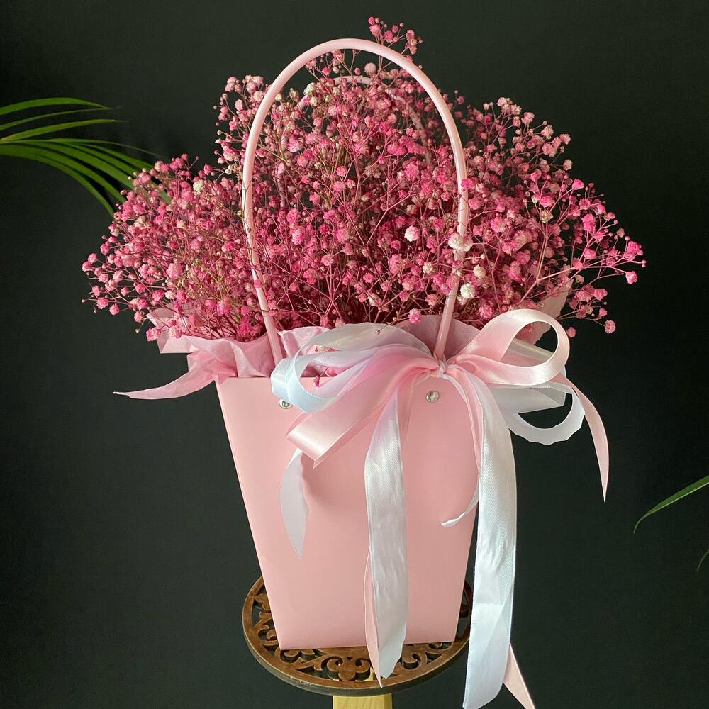 Гипсофила – 7 шт. Лента атласная – 3 шт. Тишью – 1 шт. Крафт пакет – 1 шт. Оазис флористический – 1 шт. Слюда упаковка – 3 шт.