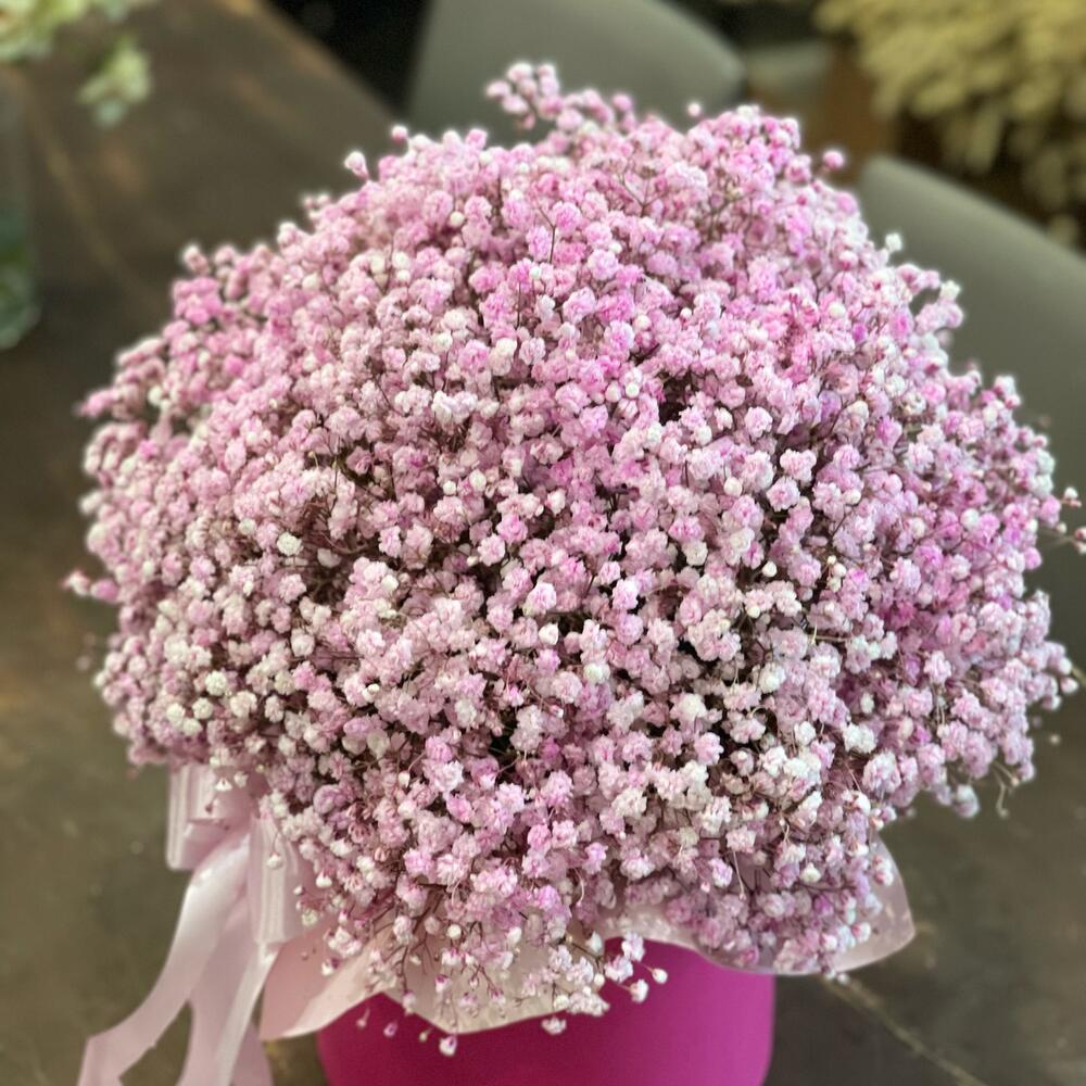 гипсофила розовая премиум – 50 шт.Оазис флористический – 1 шт.Шляпная коробка – 1 шт.Лента атласная – 2 шт.