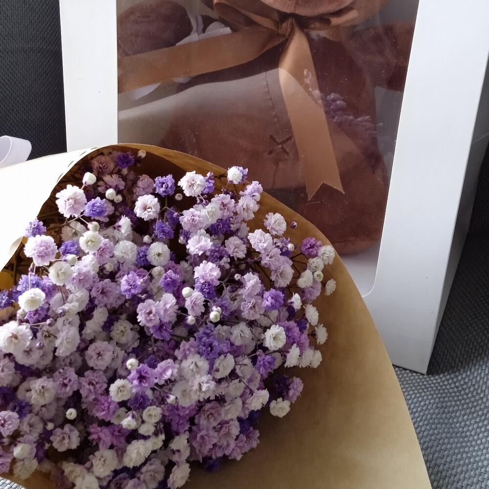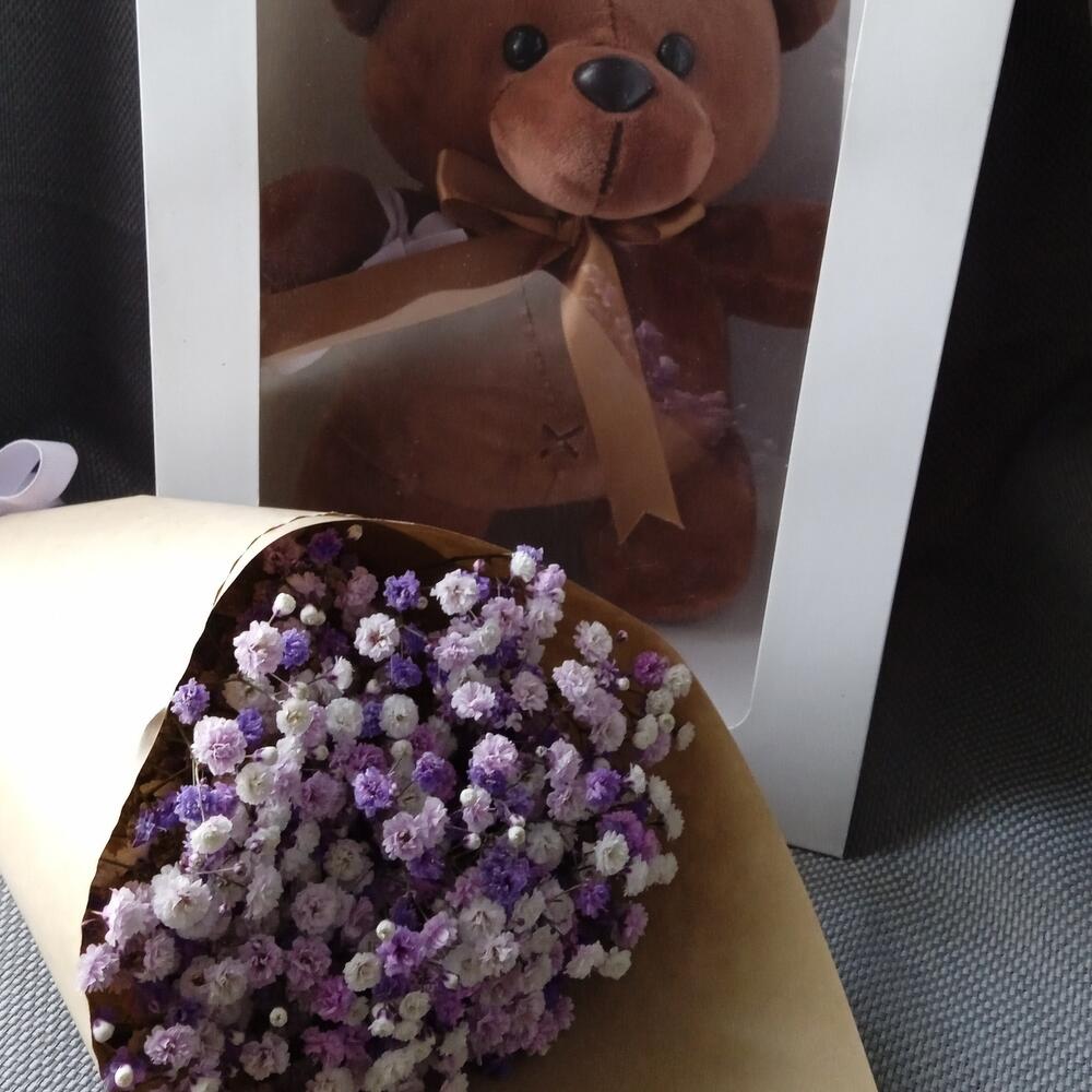 Гипсофила – 3 шт.Лента атласная – 1 шт.Крафт – 1 шт.Пакет подарочный – 1 шт.Мишка плюшевый – 1 шт.