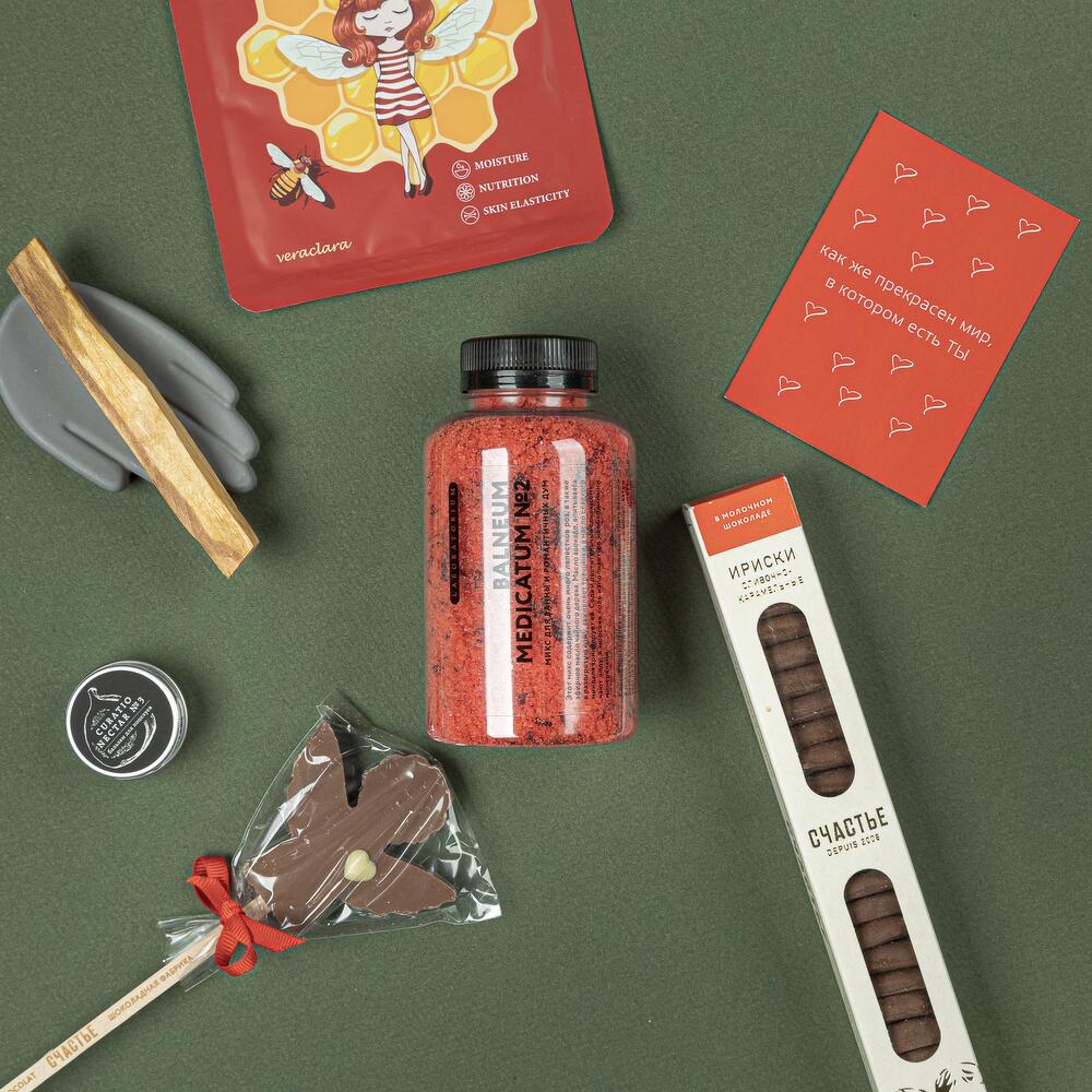 соль для ванной laboratorium – 1 шт.ириски “счастье” – 1 шт.благовоние пало санто – 1 шт.подставка-ладошка для благовоний из гипсофила – 1 шт.бальзам для губ laboratorium – 1 шт.ангел “счастье” – 1 шт.маска тканевая для лица – 1 шт.