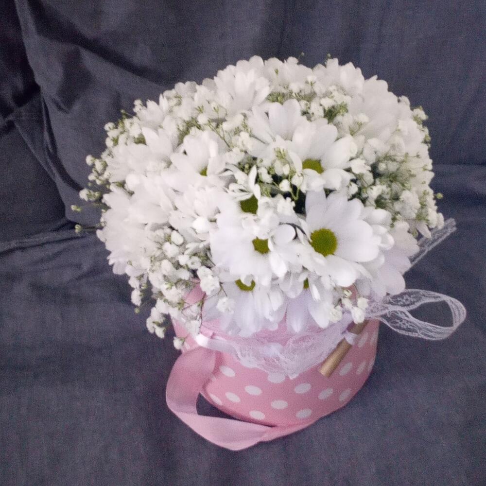Ромашка – 25 шт.Гипсофила – 9 шт.Шляпная коробка – 1 шт.Флористическая губка – 1 шт.Лента – 1 шт.
