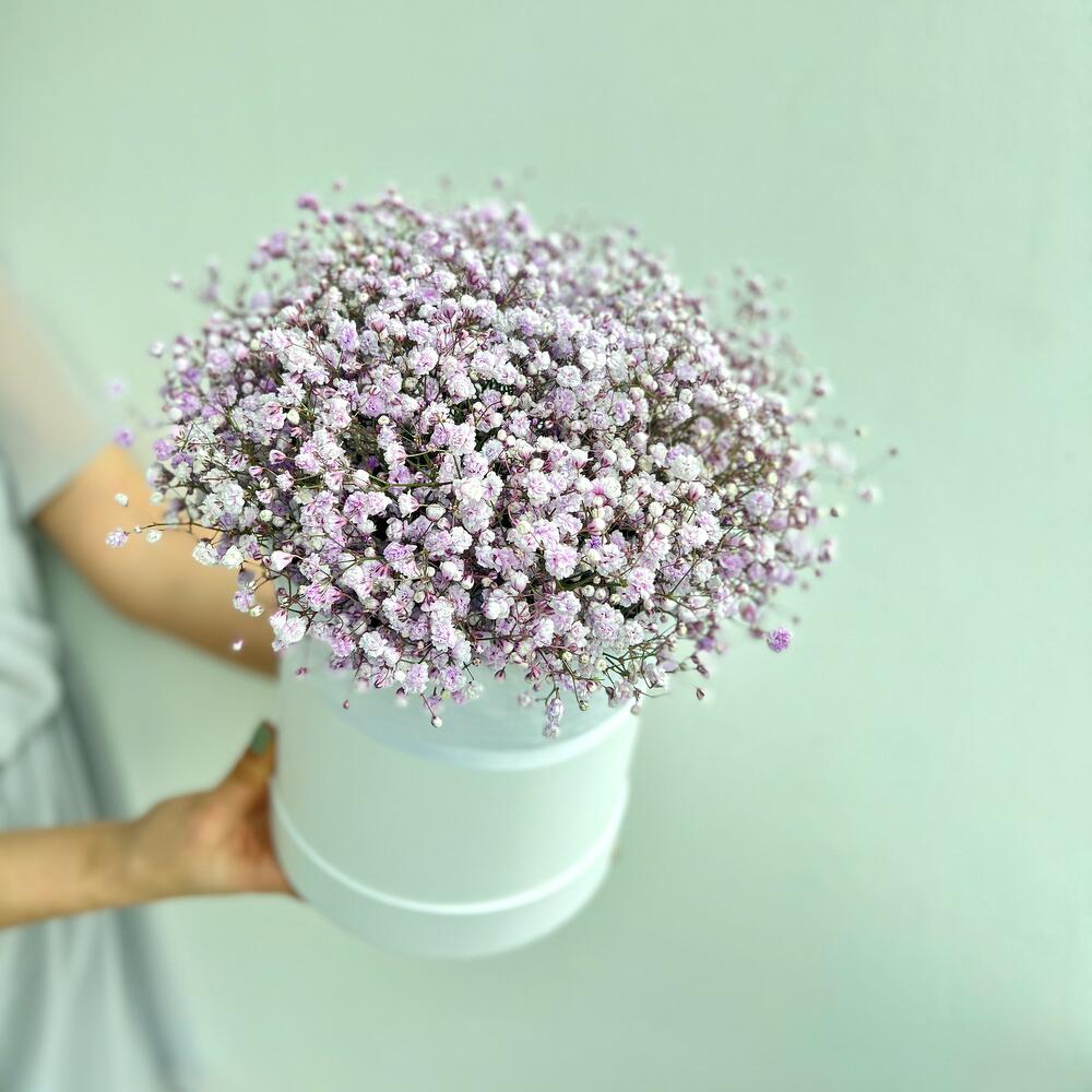 Композиция из 7 стеблей нежной фиолетовой гипсофилы в светлой шляпной коробке