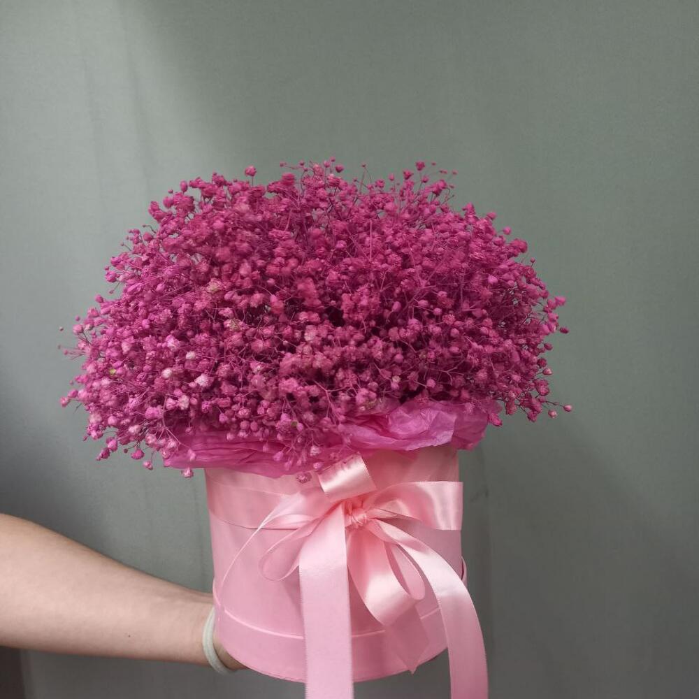 гипсофила темно-розовая окрашенная – 7 шт.Шляпная коробка – 1 шт.Оазис – 1 шт.Атласная лента – 1 шт.