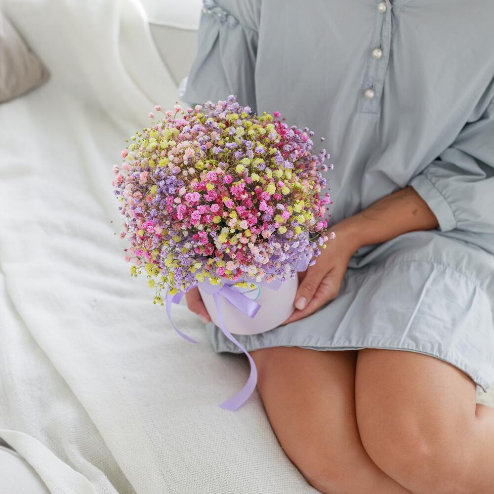 Очаровательная, воздушная композиция из гипсофилы, в шляпной коробке.Цветы стоят в специальной флористической губке,что позволяет им больше оставаться свежими и радовать получателя. Так же композиция в коробке это очень удобно и эффектно, так как не надо ставить букет в вазу и менять воду. Необходимо лишь подливать в губку воду.Инструкция по уходу за цветами прикреплена к каждому заказу.Цветы гипсофилы отличаются стойкостью и даже при высыхании не теряют, декоративности и цвета. Что позволяет, долгое время украшать интерьер в качестве сухоцветов.Подпишем открытку с вашими пожеланиями бесплатно
