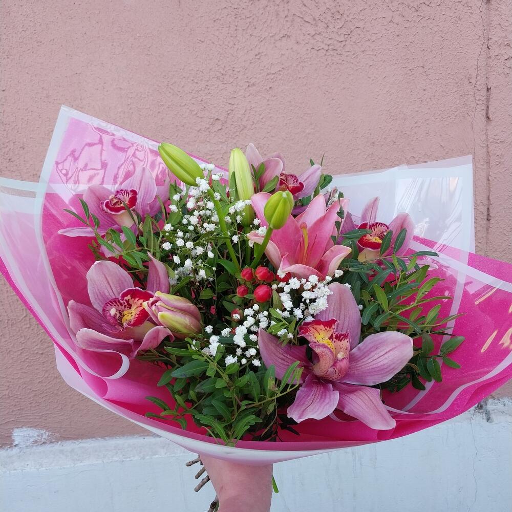 Гипсофила – 1 шт.Упаковка дизайнерская – 3 шт.Орхидея Цимбидиум розовый – 5 шт.Хиперикум красный – 2 шт.фисташка зелень – 10 шт.лилия розовая азиатская – 1 шт.