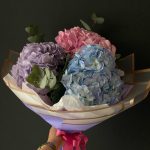Гортензия – 3 шт. Эвкалипт – 4 шт. Лента атласная – 3 шт. Тишью – 2 шт. Слюда упаковка – 2 шт. салфетка декоративная – 4 шт.