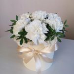 Гвоздика – 7 шт.Лента атласная – 2 шт.Тишью – 1 шт.Коробка шляпная – 1 шт.Оазис флористический – 1 шт.зелень декоративная – 3 шт.