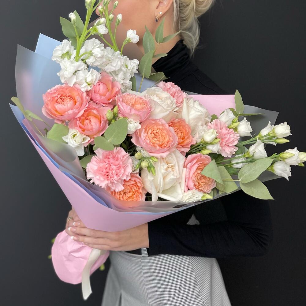 Букет из пионовидных персиковых роз и эвкалипта