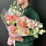 Лизиантус – 2 шт.Маттиола – 2 шт.Эвкалипт – 1 шт.Гвоздика – 3 шт.Фисташка – 3 шт.Упаковка дизайнерская – 3 шт