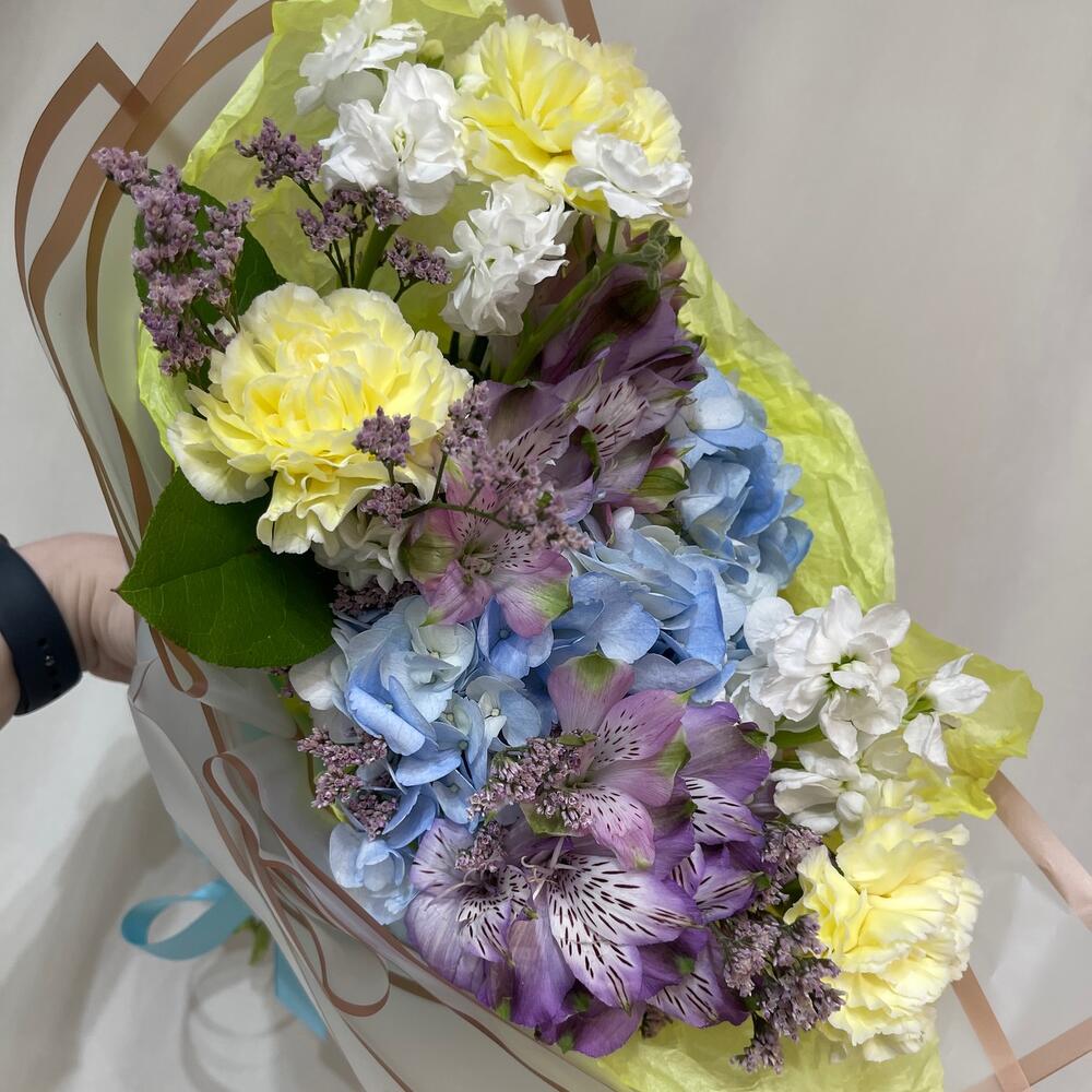 Гортензия голубая – 1 шт.Маттиола – 2 шт.Диантус – 3 шт.алсьтрамерия – 2 шт.Лимониум – 1 шт.