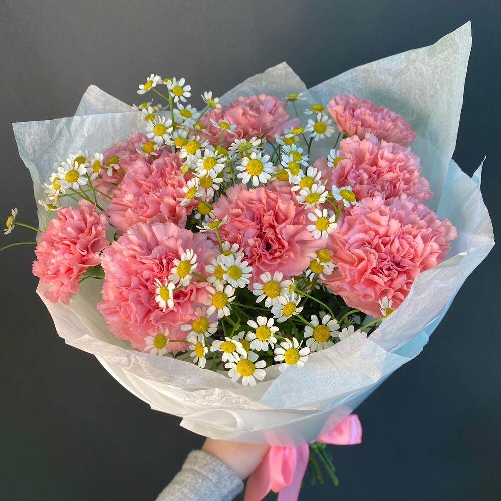 гвоздика розовая диантус – 9 шт.ромашка кустовая танацетум – 3 шт.зелень декоративная ветка – 1 шт.Упаковка дизайнерская – 5 шт.
