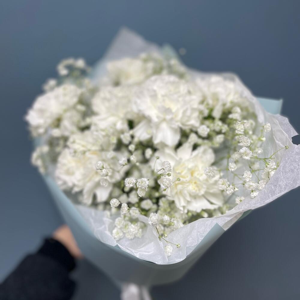 Диантус – 7 шт.Гипсофила – 3 шт.Упаковка – 1 шт.Тишью – 2 шт.Лента атласная – 1 шт.