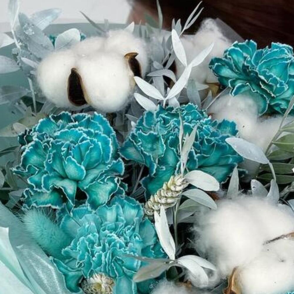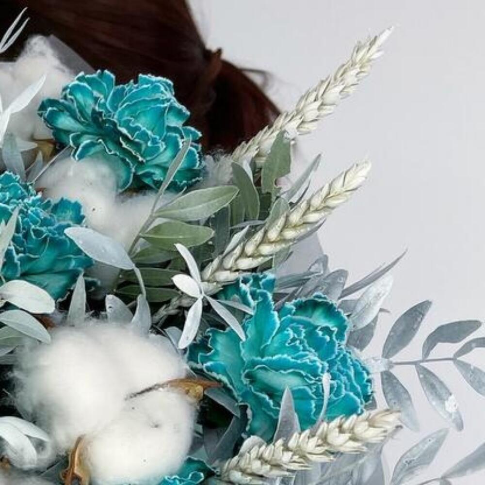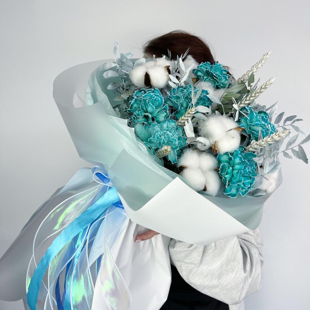 Гвоздика – 7 шт.Лента атласная – 4 шт.Фисташка – 3 шт.Пленка матовая – 4 шт.Хлопок натуральный – 5 шт.Тишью белое – 4 шт.колосок полевой – 5 шт.