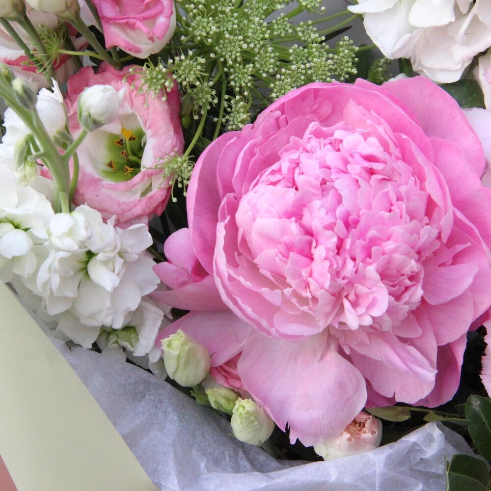 Пион – 1 шт.Лизиантус – 1 шт.Маттиола – 2 шт.Амми – 1 шт.Гвоздика – 1 шт.Лагурус – 5 шт.Эвкалипт – 2 шт.Упаковка дизайнерская – 1 шт.Лента атласная – 1 шт.