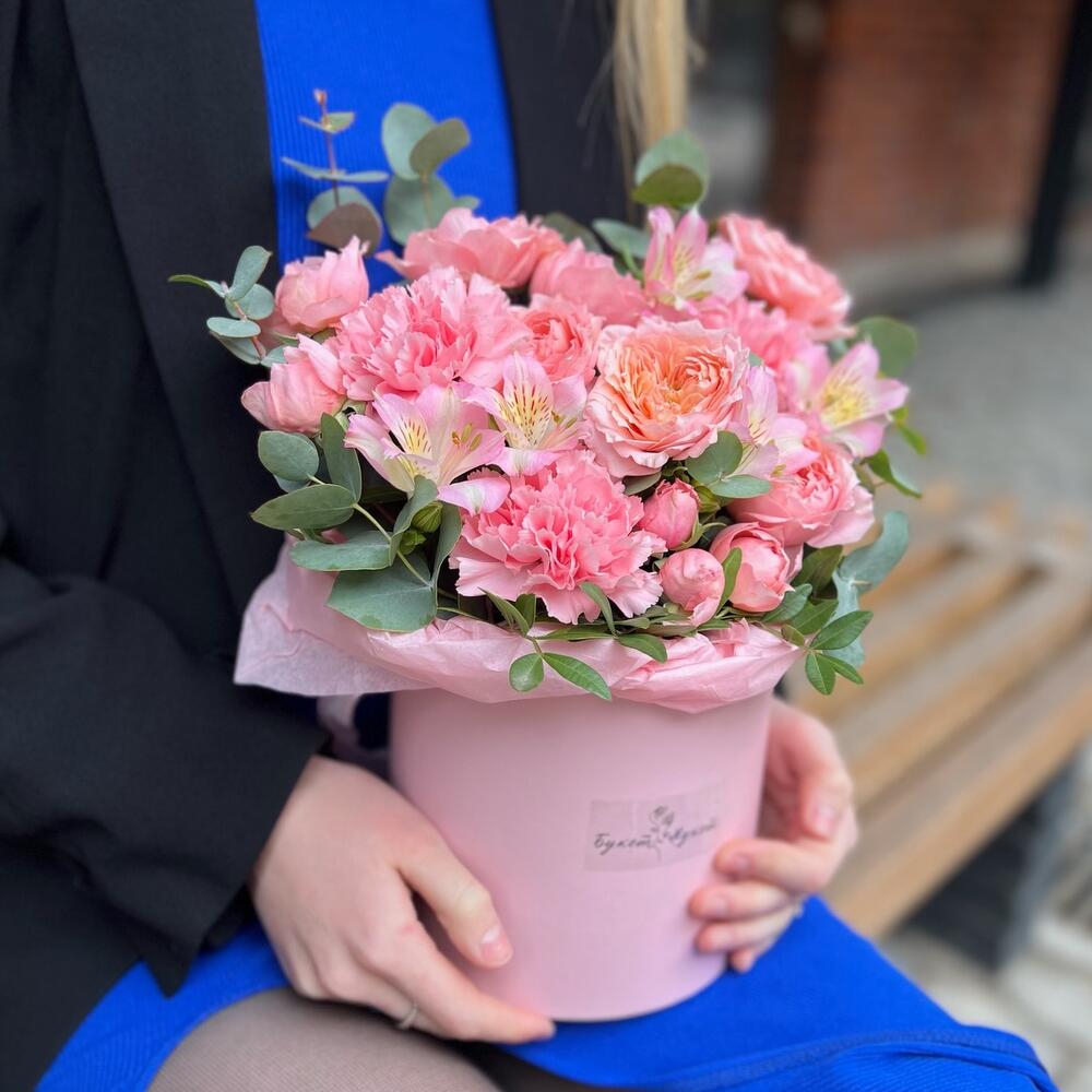 Альстромерия – 1 шт.Эвкалипт – 1 шт.Тишью – 2 шт.Диантус – 3 шт.Коробка шляпная – 1 шт.Роза пионовидная кустовая – 2 шт.Фисташка – 1 шт.