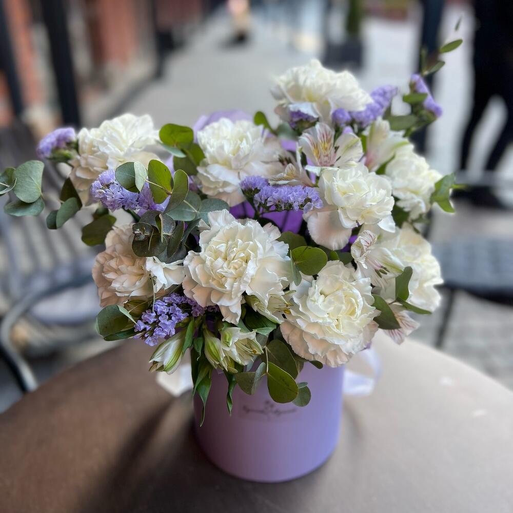 Альстромерия – 2 шт.Статица – 2 шт.Эвкалипт – 1 шт.Тишью – 1 шт.Диантус – 9 шт.Коробка шляпная – 1 шт.Оазис флористический – 1 шт.