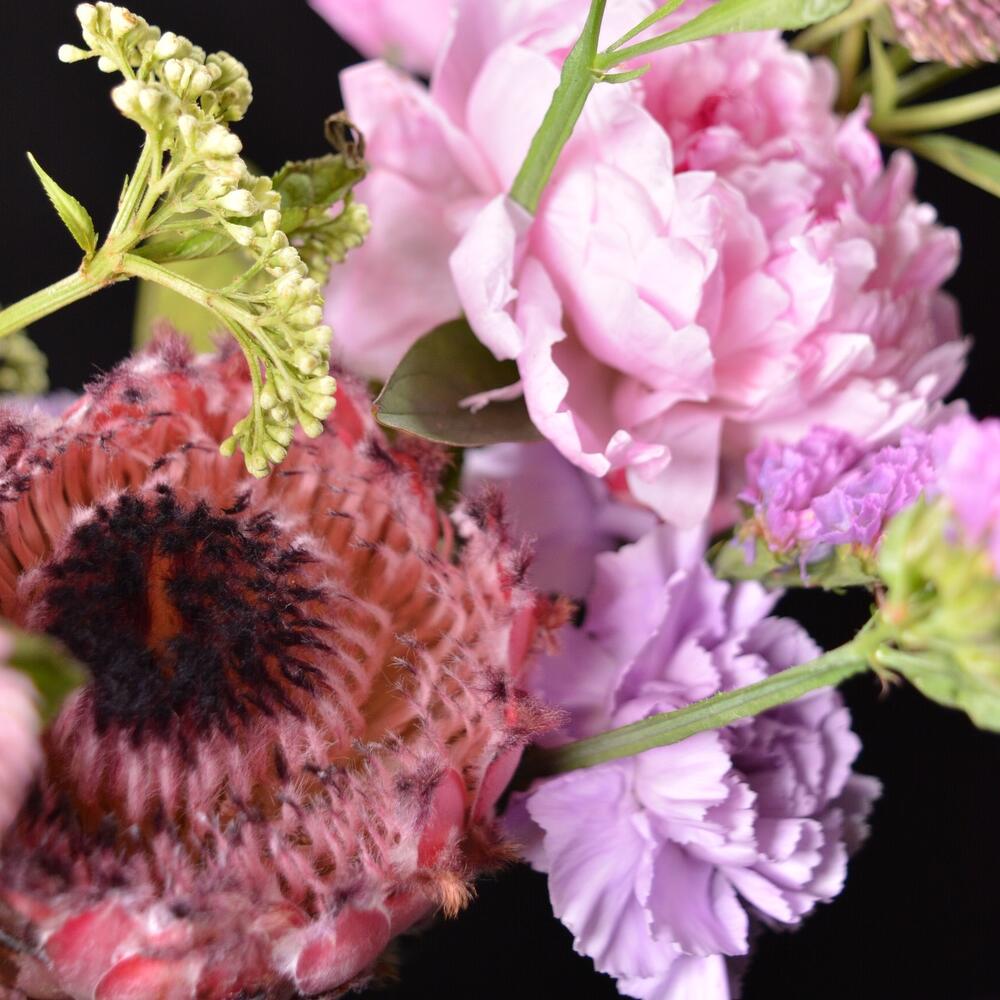 Пион – 5 шт.Протея – 1 шт.Зелень – 3 шт.Гвоздика – 3 шт.мелкоцвет – 3 шт.