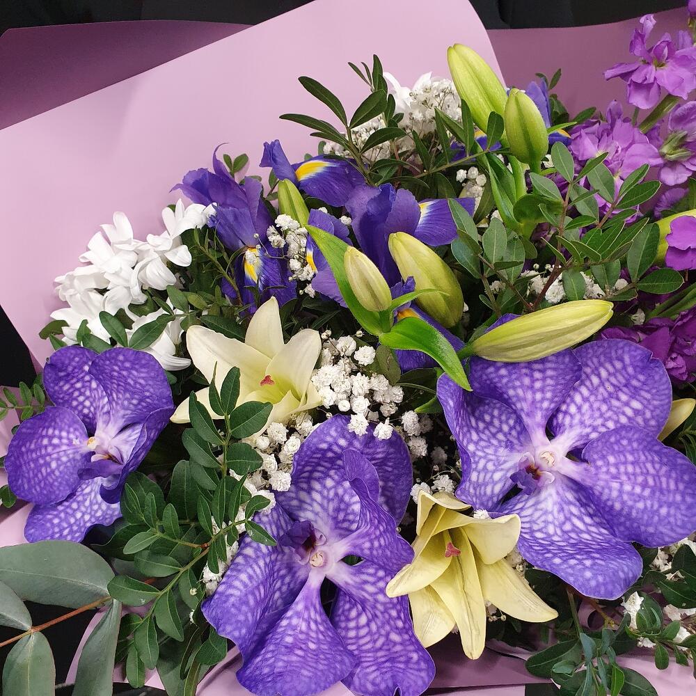 Азиатская лилия – 2 шт.Ирис – 3 шт.Гипсофила – 2 шт.Хризантема кустовая – 3 шт.Орхидея Ванда – 3 шт.Маттиола – 3 шт.Эвкалипт – 2 шт.Фисташка – 6 шт.Упаковка дизайнерская – 2 шт.