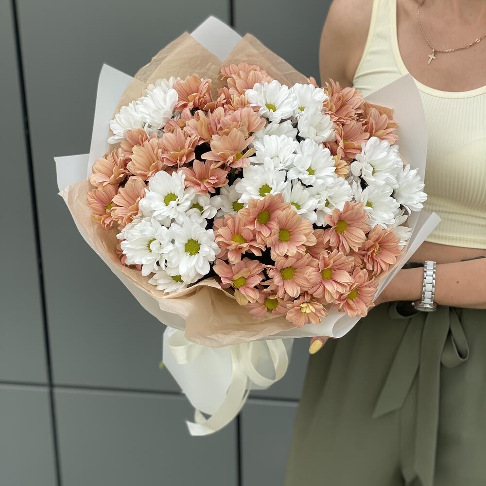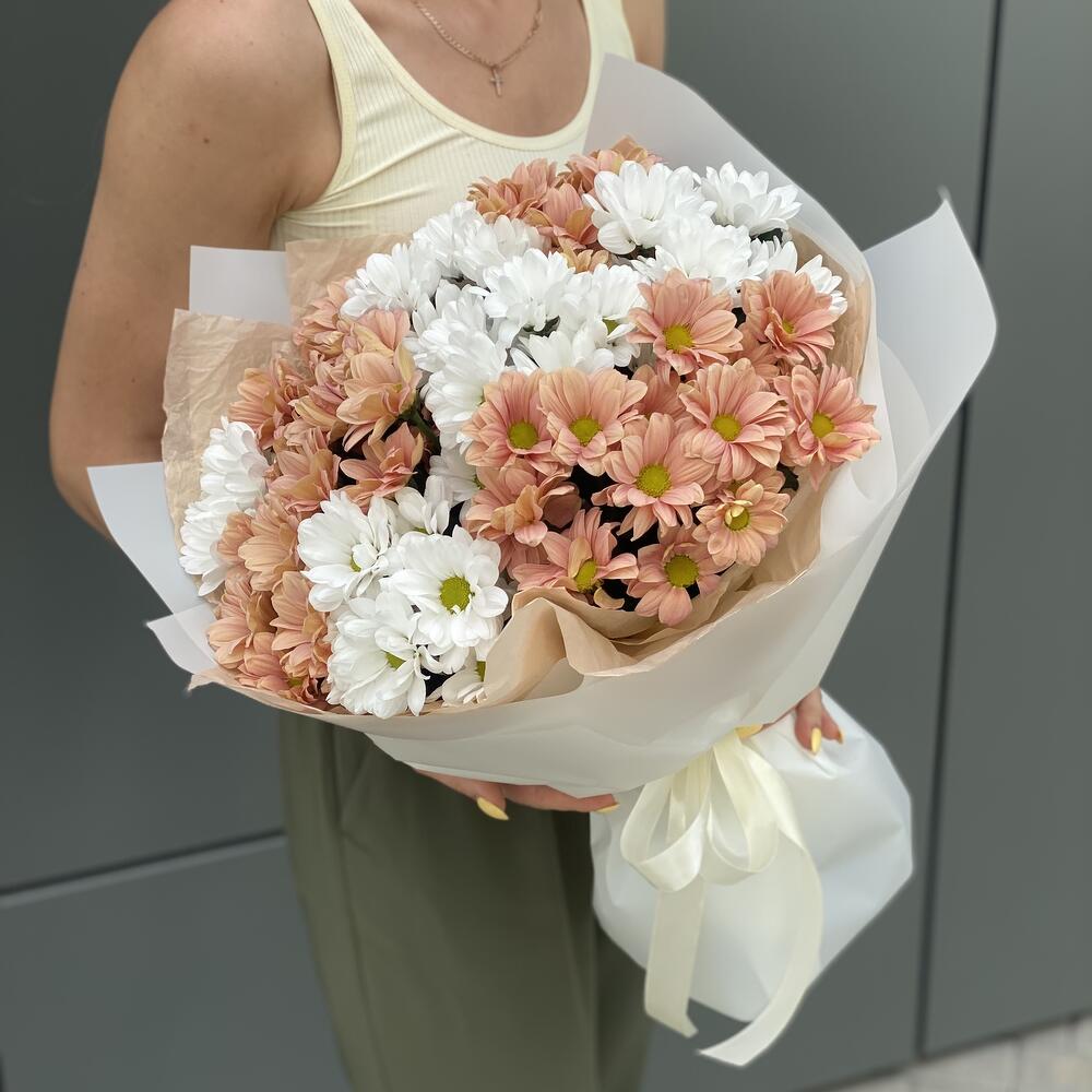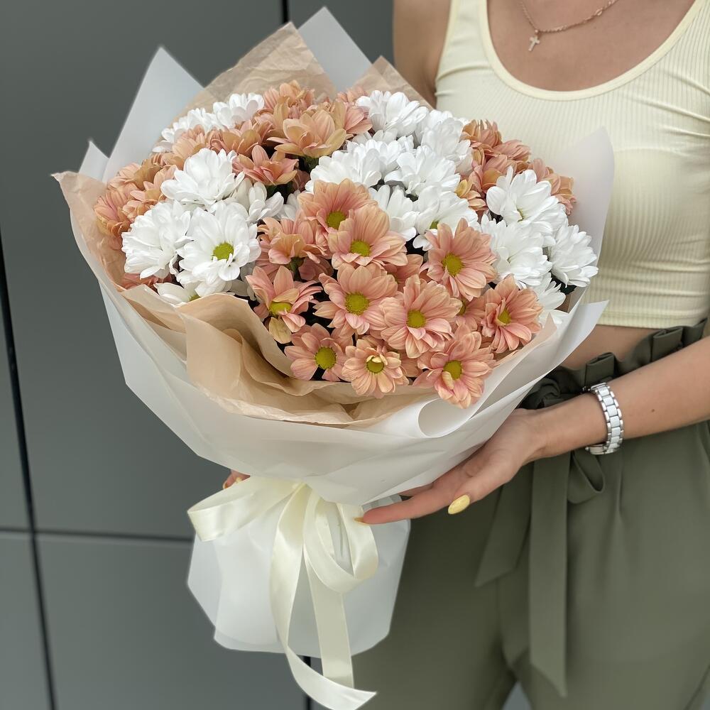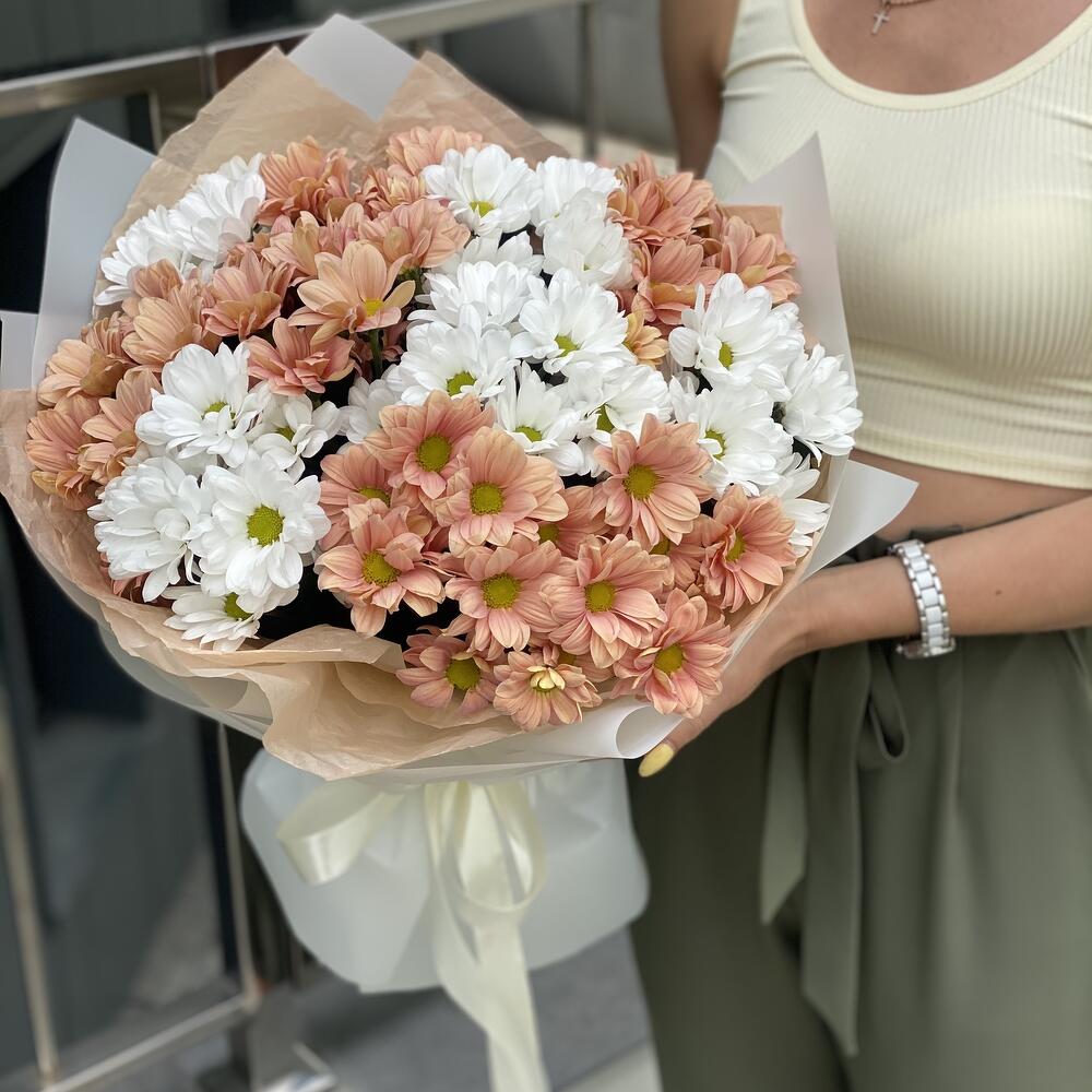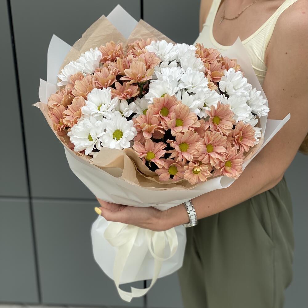 Букет из персиковой и белой ромашковой хризантемы в оформлении!