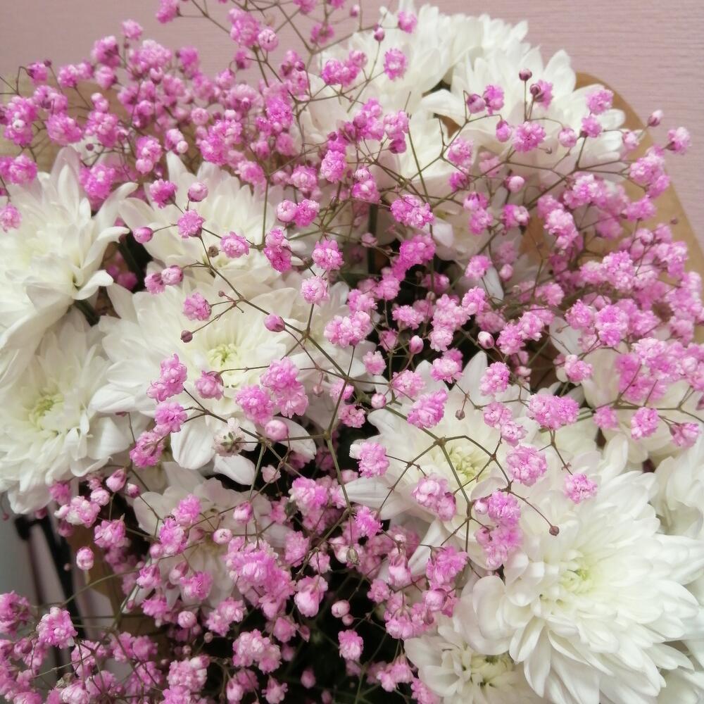 Хризантема кустовая – 3 шт.Упаковка – 1 шт.Лента атласная – 1 шт.Гипсофила розовая – 2 шт.