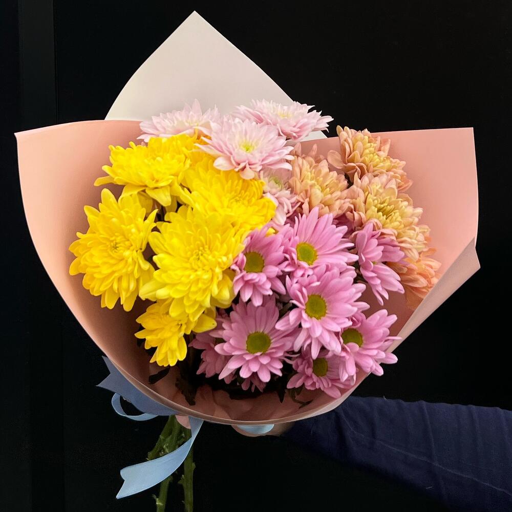 Хризантема голландия – 5 шт. Открыточка с вашими пожеланиями – 1 шт. Дизайнерская упаковка – 2 шт. инструкция по уходу за цветами – 1 шт.