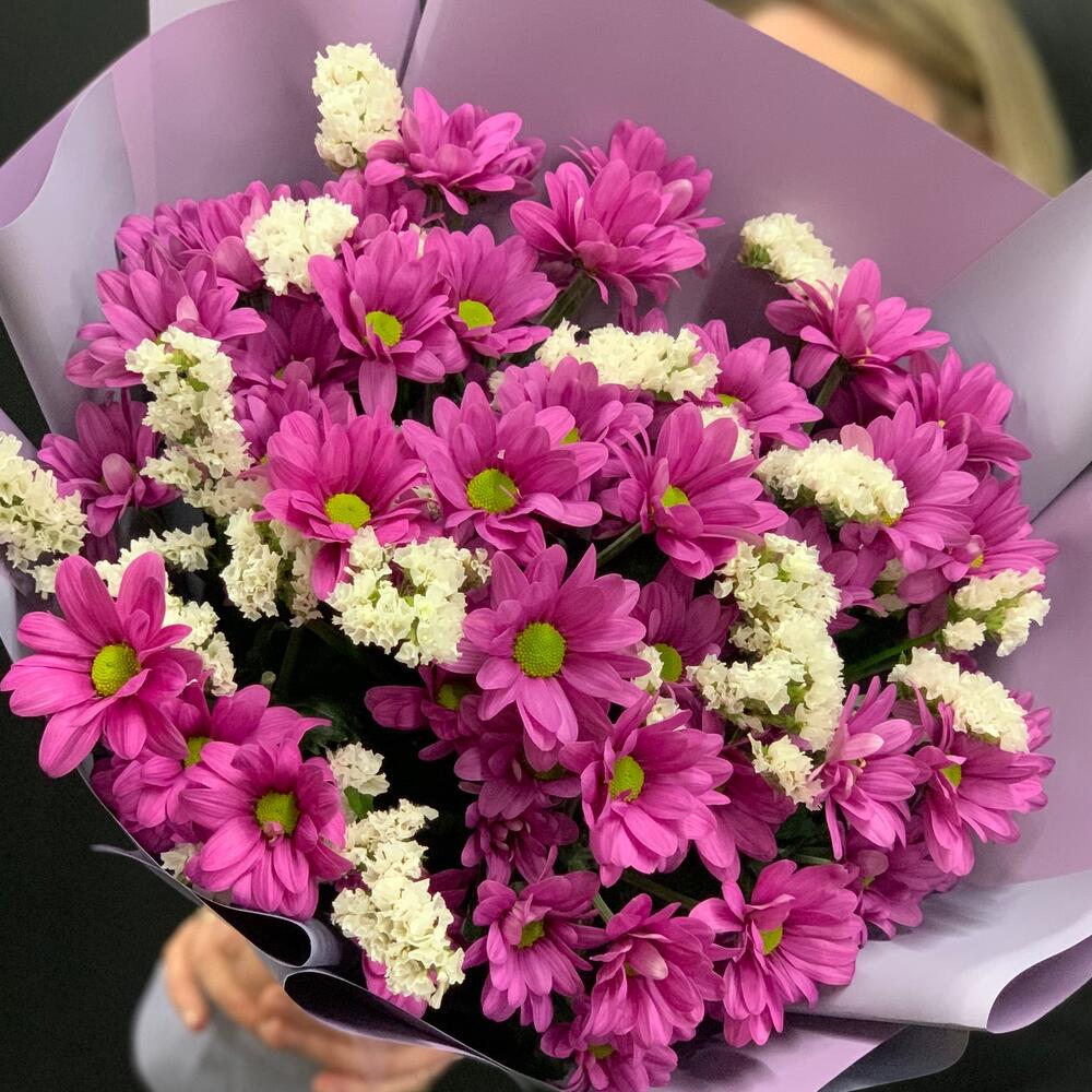 Хризантема кустовая – 7 шт.Статица – 2 шт.Упаковка дизайнерская – 1 шт.