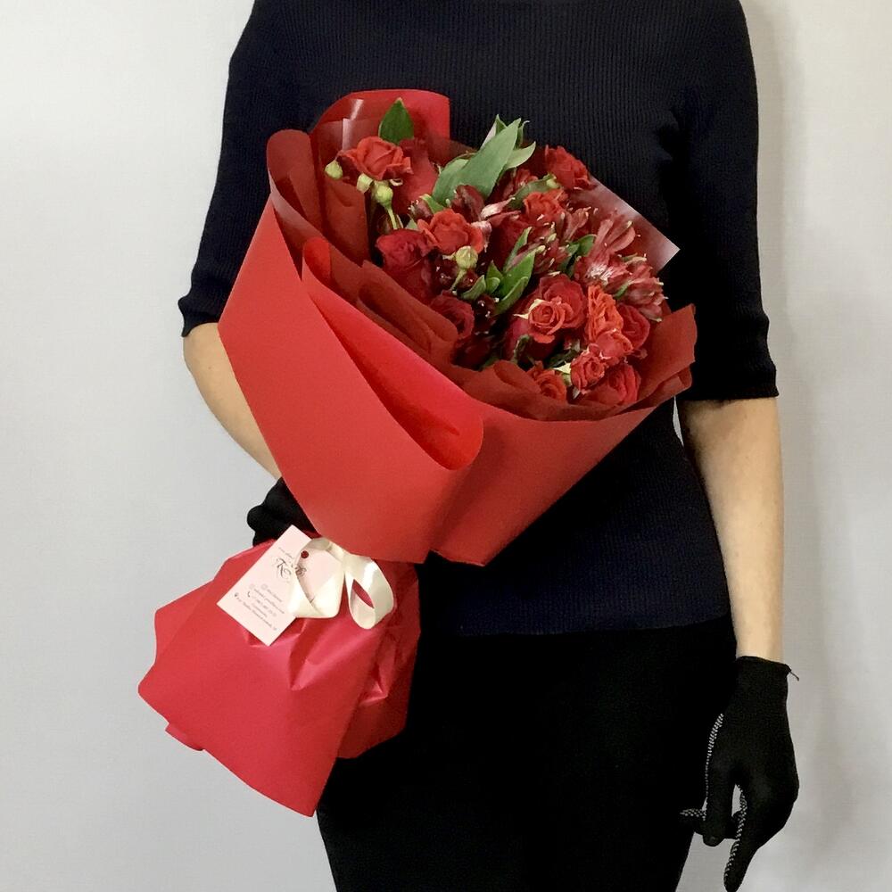 Букет с розами, альстромерией и кустовой розой «Рубин»