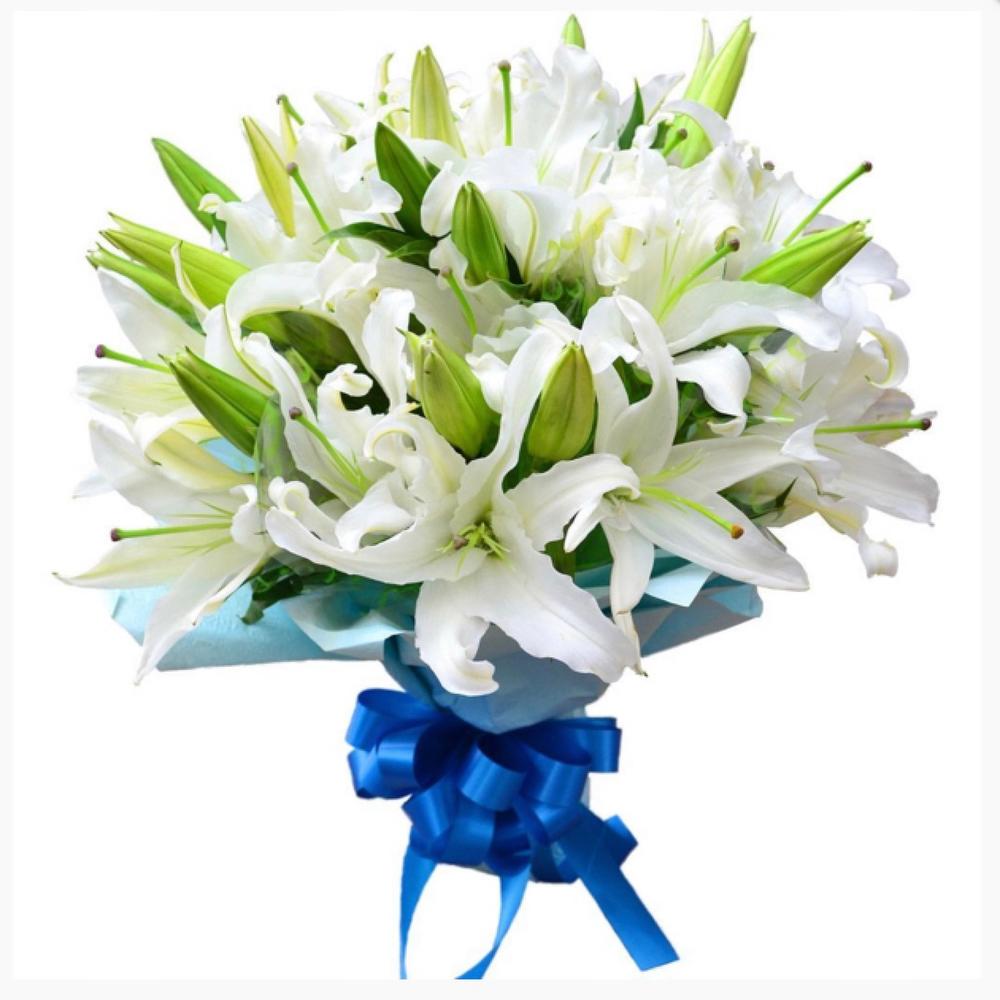 лилии – 15 шт.дизайнерская упаковка и атласная лента – 1 шт.