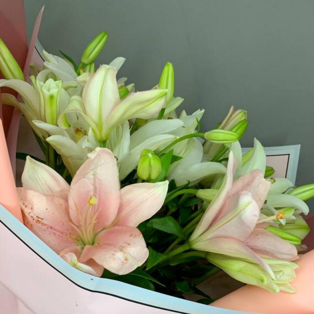 лилия ориентальная розовая – 7 шт.лилия ориентальная белая – 8 шт.Упаковка дизайнерская – 2 шт.Атласная лента – 1 шт.