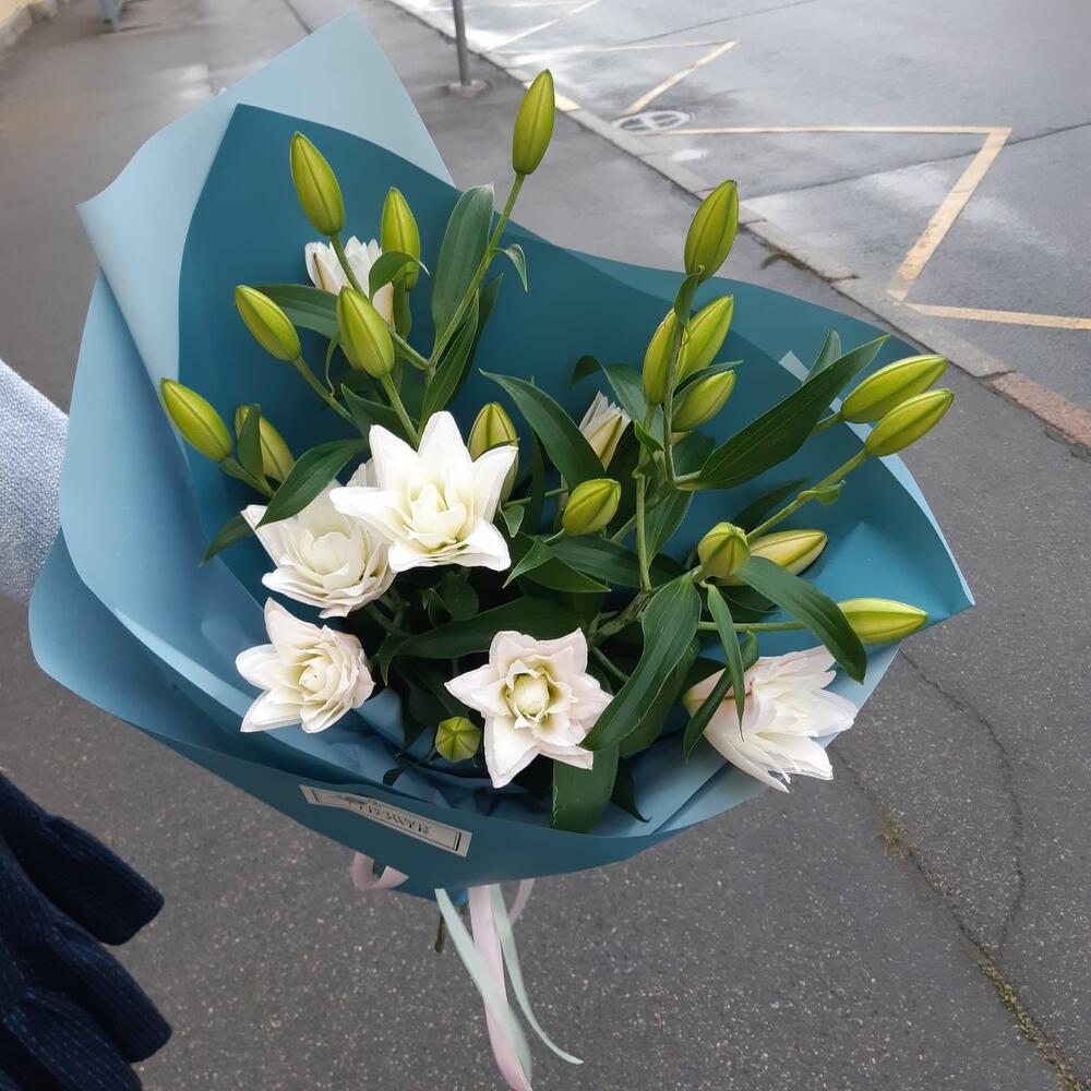 Букет из 5 махровых лилий в стильной упаковке “Дроэда”