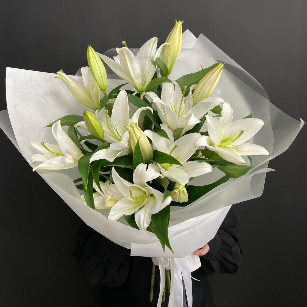 Лента атласная – 3 шт.Крафт белый – 2 шт.Пленка дизайнерская – 3 шт.лилия голландия белая – 5 шт.