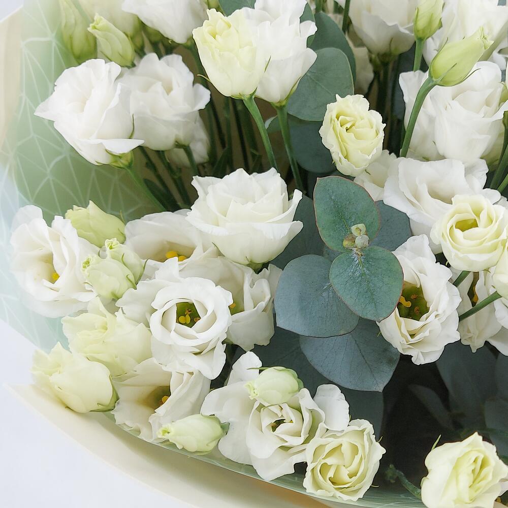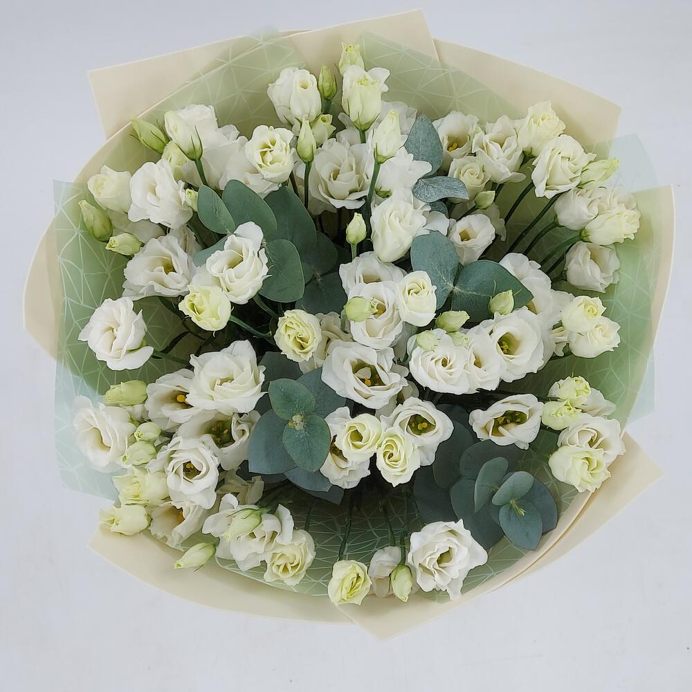 Эустома – 9 шт.Эвкалипт – 5 шт.Пистация – 4 шт.Упаковка дизайнерская – 1 шт.