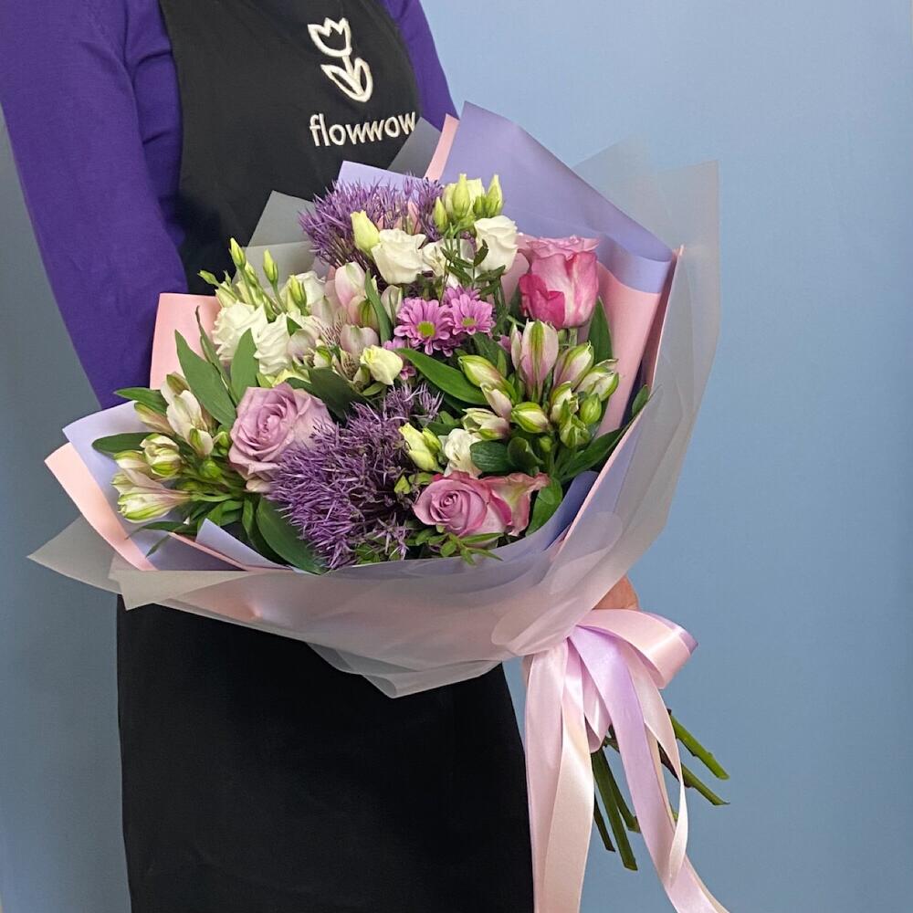 Альстромерия – 3 шт.Лизиантус – 2 шт.Лента атласная – 2 шт.Сантини – 1 шт.Фисташка – 3 шт.Аллиум – 2 шт.Упаковка дизайнерская – 2 шт.Роза премиум – 3 шт.