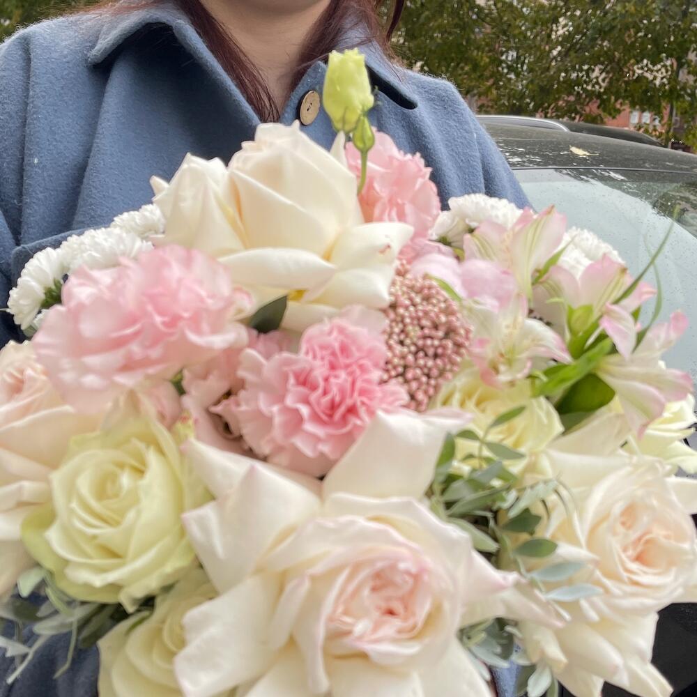 Нежная шикарная композиция порадует и удивит родных .Сочетание самых нежных роз произведёт самые приятные впечатления !Уважаемые покупатели! Пожалуйста обратите ваше внимание на размер композиции при заказе! Он учитывается вместе с упаковкой Чтобы наши прекрасные композиции дольше радовали получателя рекомендуем вам:⭐Не вынимать цветы из коробки/корзинки⭐Поливать композицию каждый день (воду нужно вливать в центр, чтобы вода правильно распределилась) ⭐Не ставить цветы у отопительных приборов и на сквозняке