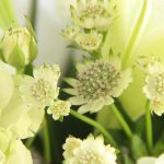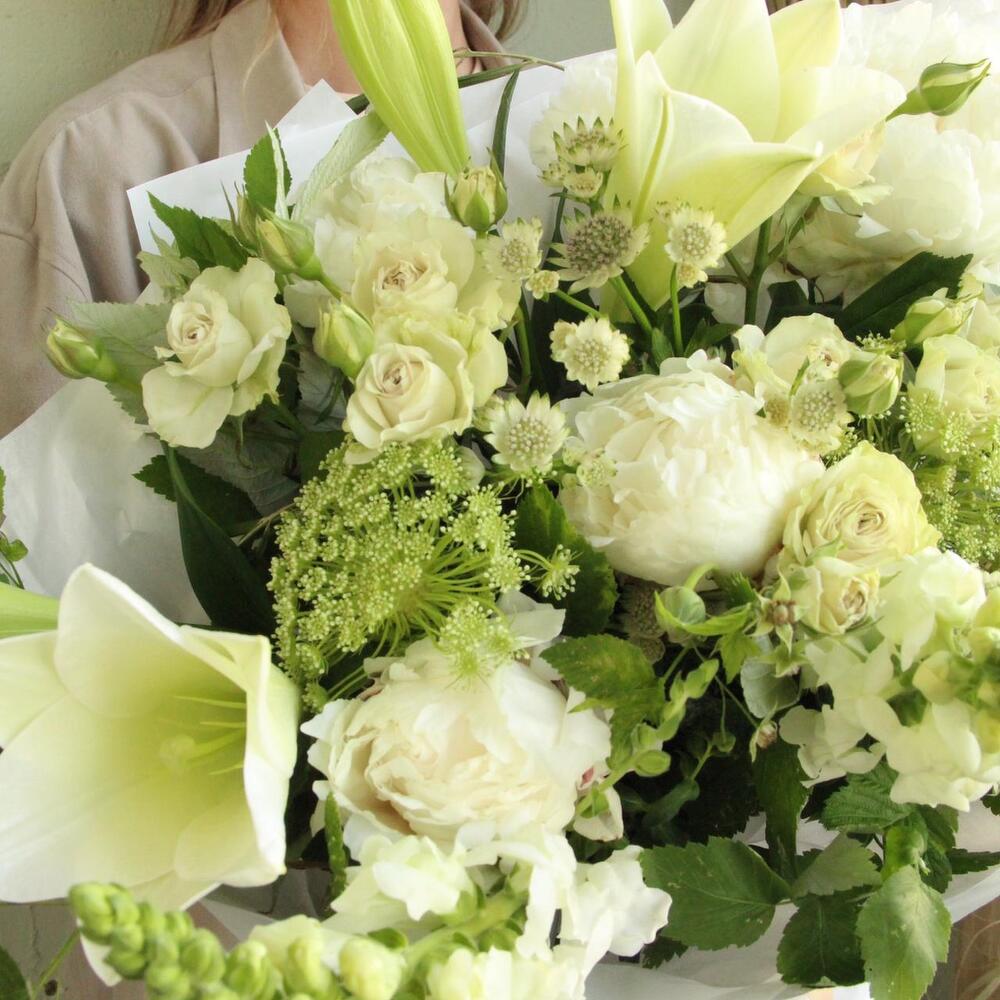 Лилия лонги – 2 шт.Амми – 3 шт.Лизиантус – 3 шт.Львиный зев – 3 шт.Ветки малины – 4 шт.Фисташка – 2 шт.Астранция – 2 шт.Упаковка – 1 шт.Лента атласная – 1 шт.Пион – 2 шт.