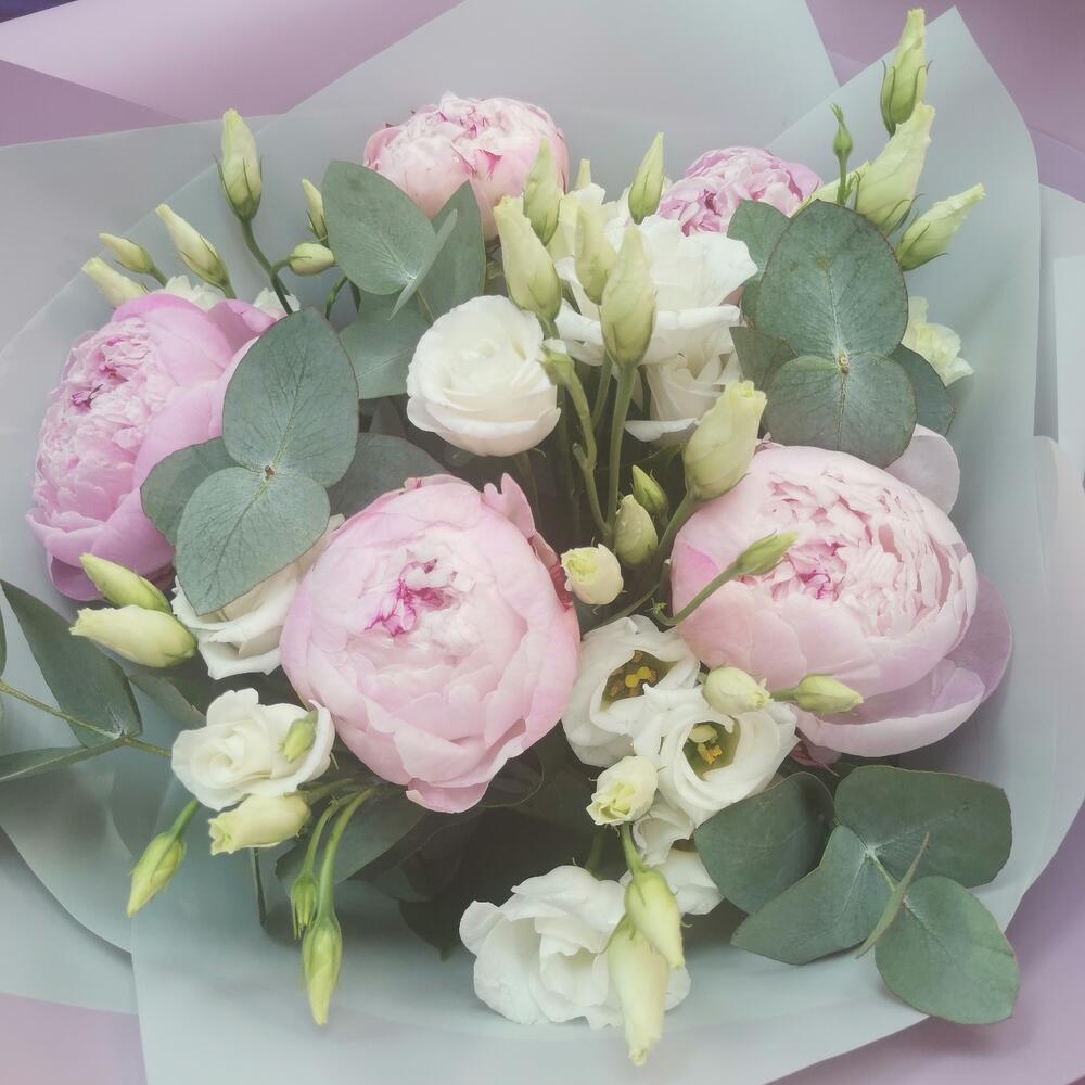 Эвкалипт – 3 шт.Лента атласная – 1 шт.Пион Сара Бернар – 5 шт.Упаковка дизайнерская – 2 шт.эустома белая – 2 шт.