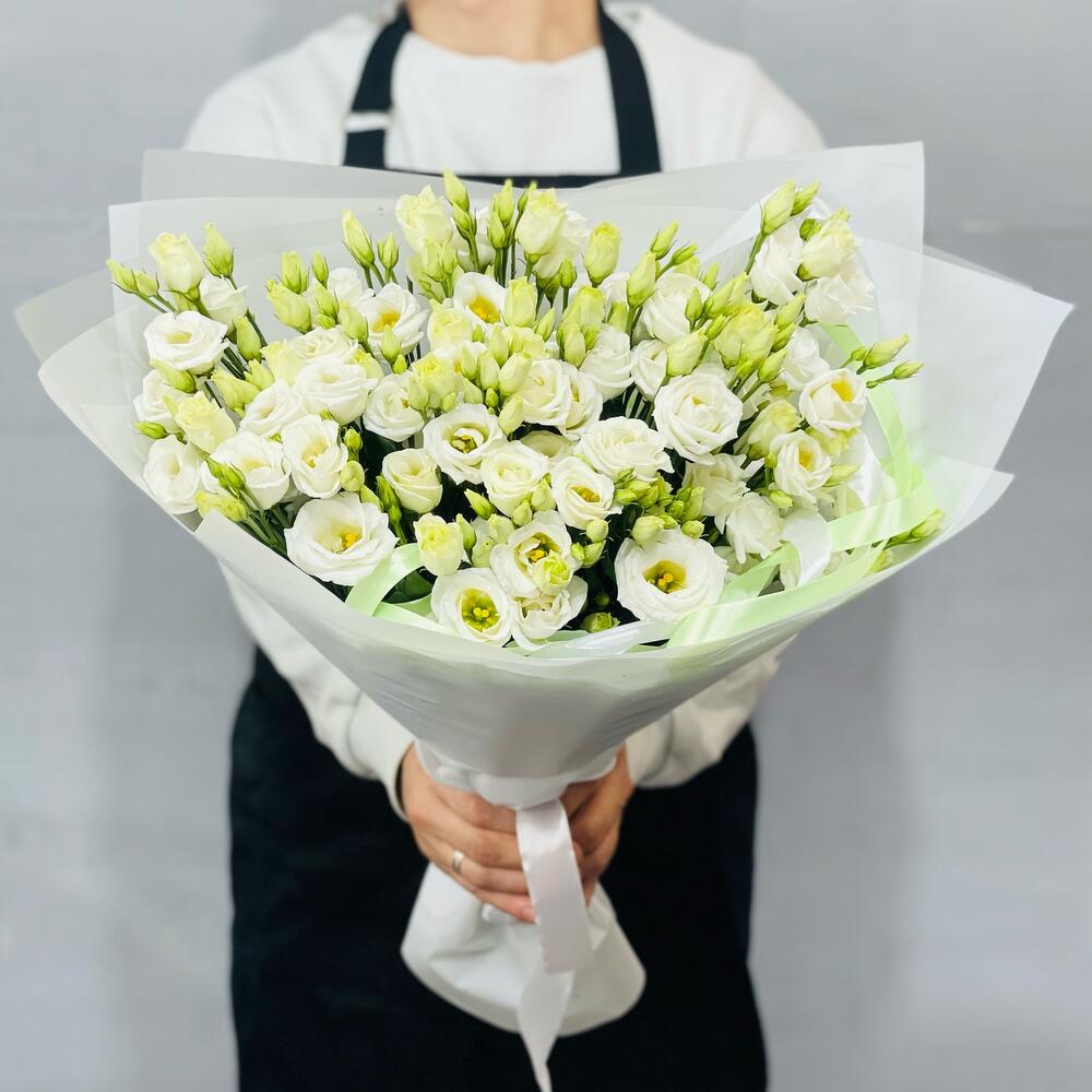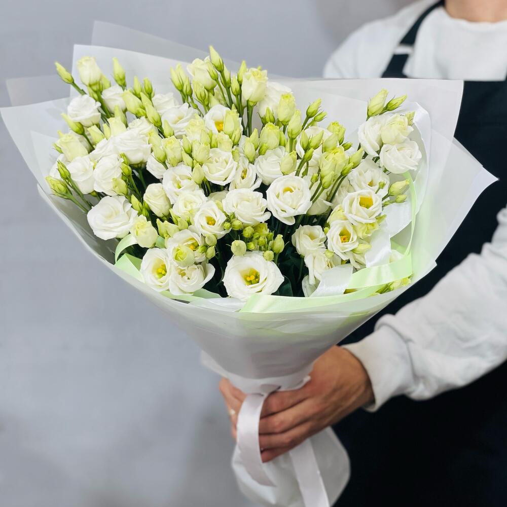 Такие нежные , белоснежные колокольчики эустом собраны в белую упаковку подарят весь спектр эмоций получателю . Эустома очень стойкий цветок. Букет будет радовать получателя продолжительное время при правильном уходе за ним.Уход :1. После доставки букета обязательно подрежьте стебли на 1-2 см под косым углом. 2. Налейте воду в вазу минимум 2/3 от высоты букета . 3. Меняйте воду , мойте вазу и подрезайте стебли каждый день. 4. Храните Цветы подальше от солнечных лучей, тепло-обогревателей, фруктов и сквозняков. 5. Если букет был доставлен в минусовую температуру, дайте цветам полежать 15-20 минут для того , чтобы они могли принять комнатную температуру. Затем подрежьте стебли и поставьте в вазу.