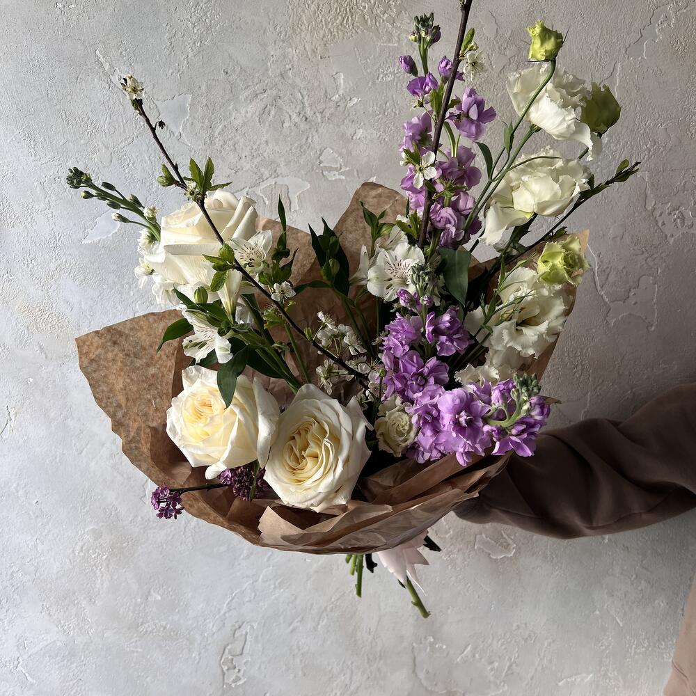 Альстромерия – 2 шт.Лизиантус – 2 шт.Маттиола – 4 шт.Сирень – 1 шт.Роза – 3 шт.Авторская упаковка – 1 шт.ветки черешни – 1 шт.
