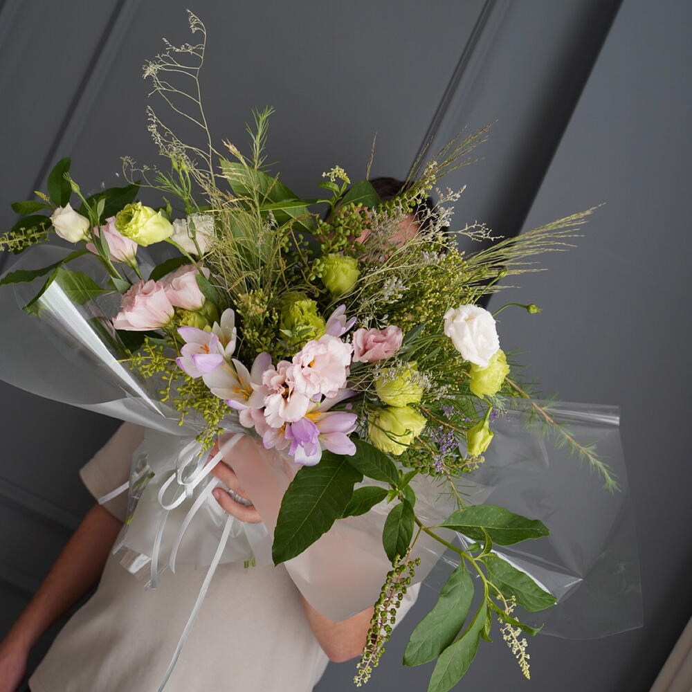 Букет Бриджит из кружевной эустомы, цимбидиума и пионовидной кустовой розы